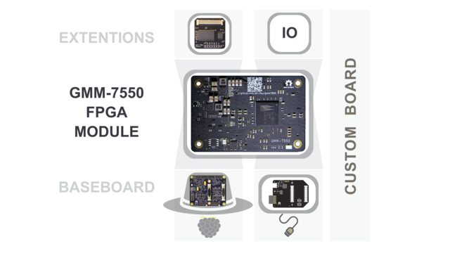The GMM-7550 is a module providing a convenient way to evaluate GateMate FPGA from Cologne Chip AG and to build custom systems around it. This site contains the documentation for the GMM-7550 module, accompany boards, configuration and control software, and FPGA design examples.